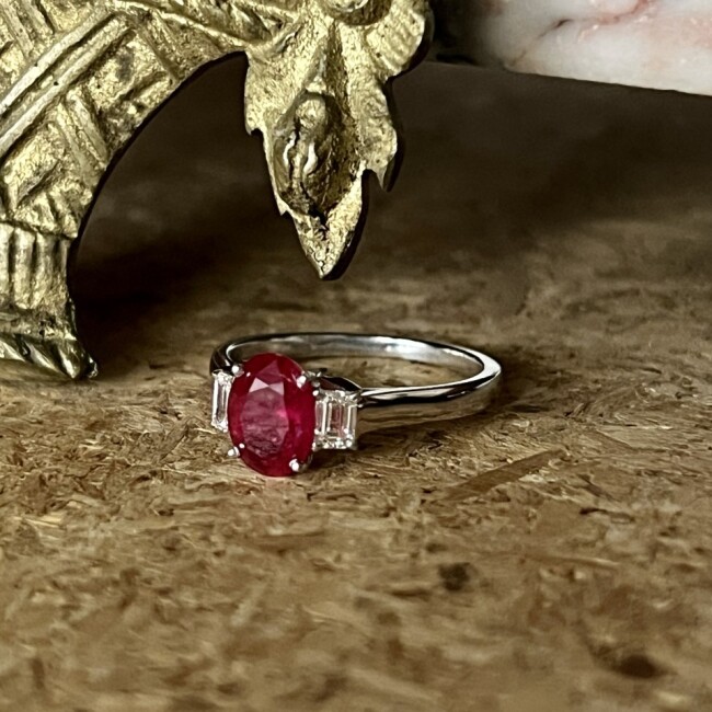 Olympe Bague Olympe en or blanc, rubis de 1,64 carat et diamants de taille émeraude