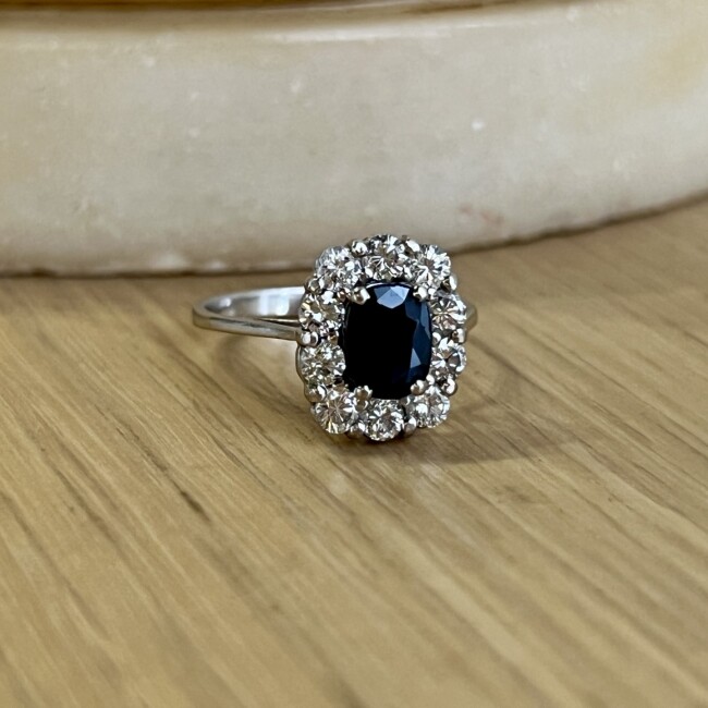 Vintage Bague Marguerite en or blanc, saphir de 0,80 carat et diamants pour 1 carat