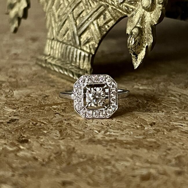 Création sur-mesure Bague en or blanc, monture d’inspiration Art Déco, sertie d’un diamant central de 0,50 carat et diamants