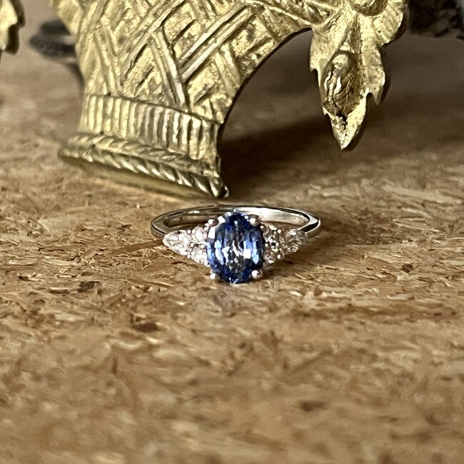 Pemba Bague Pemba en or blanc, saphir de Ceylan de taille ovale de 1,35 carat, diamants de taille poire et diamants