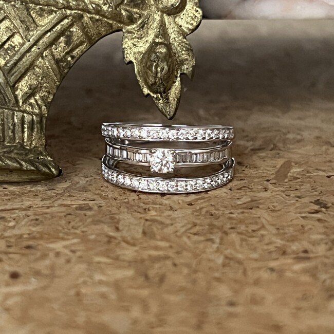 Structure Bague Structure en or blanc, diamant central de 0,70 carat, diamants de taille baguette et diamants
