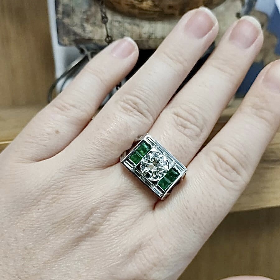 Bague Art Déco en or blanc, diamant central de taille ancienne de 2,24 carats, émeraudes de 0,92 carat et diamants de taille baguette de 1,38 carat