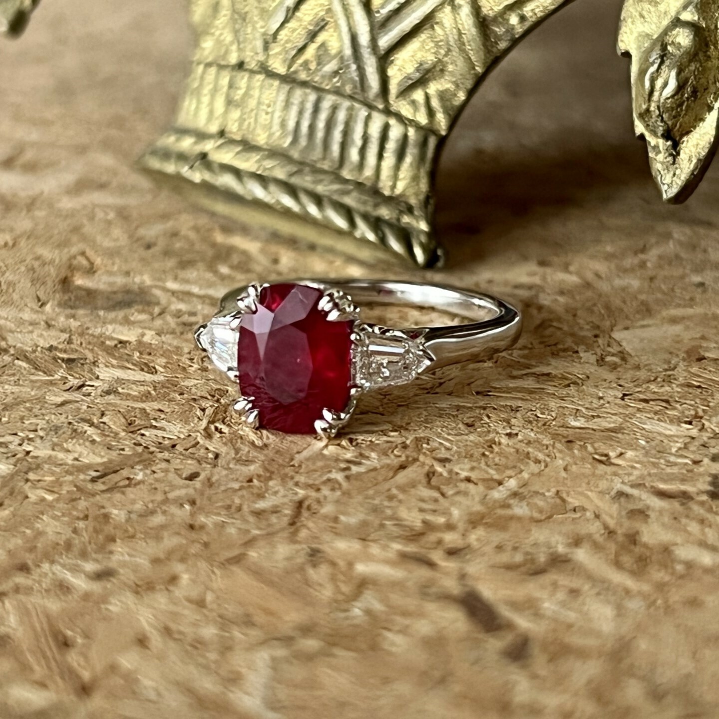 Bague en or blanc, rubis du Mozambique « Sang de pigeon » de 3,01 carats et diamants de taille baguette