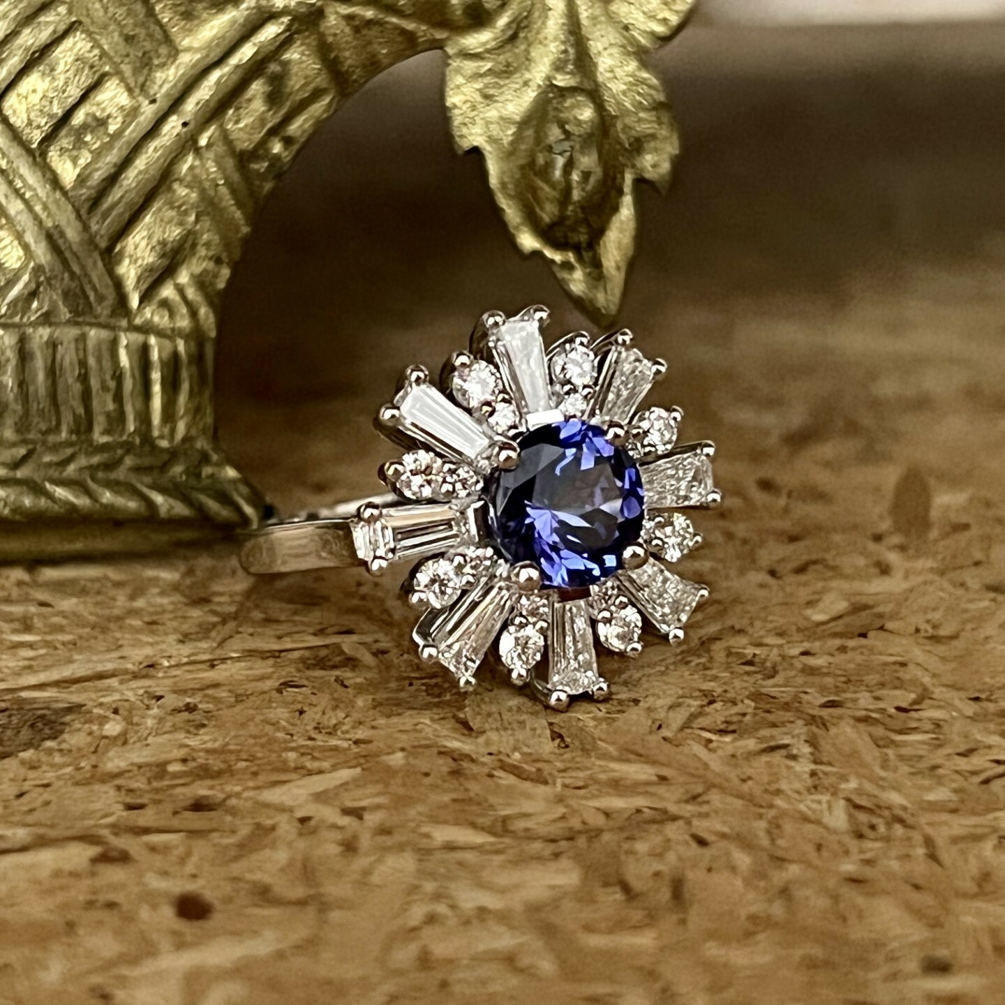 Bague en or blanc, tanzanite de 1,53 carat, diamants de taille tapers et diamants