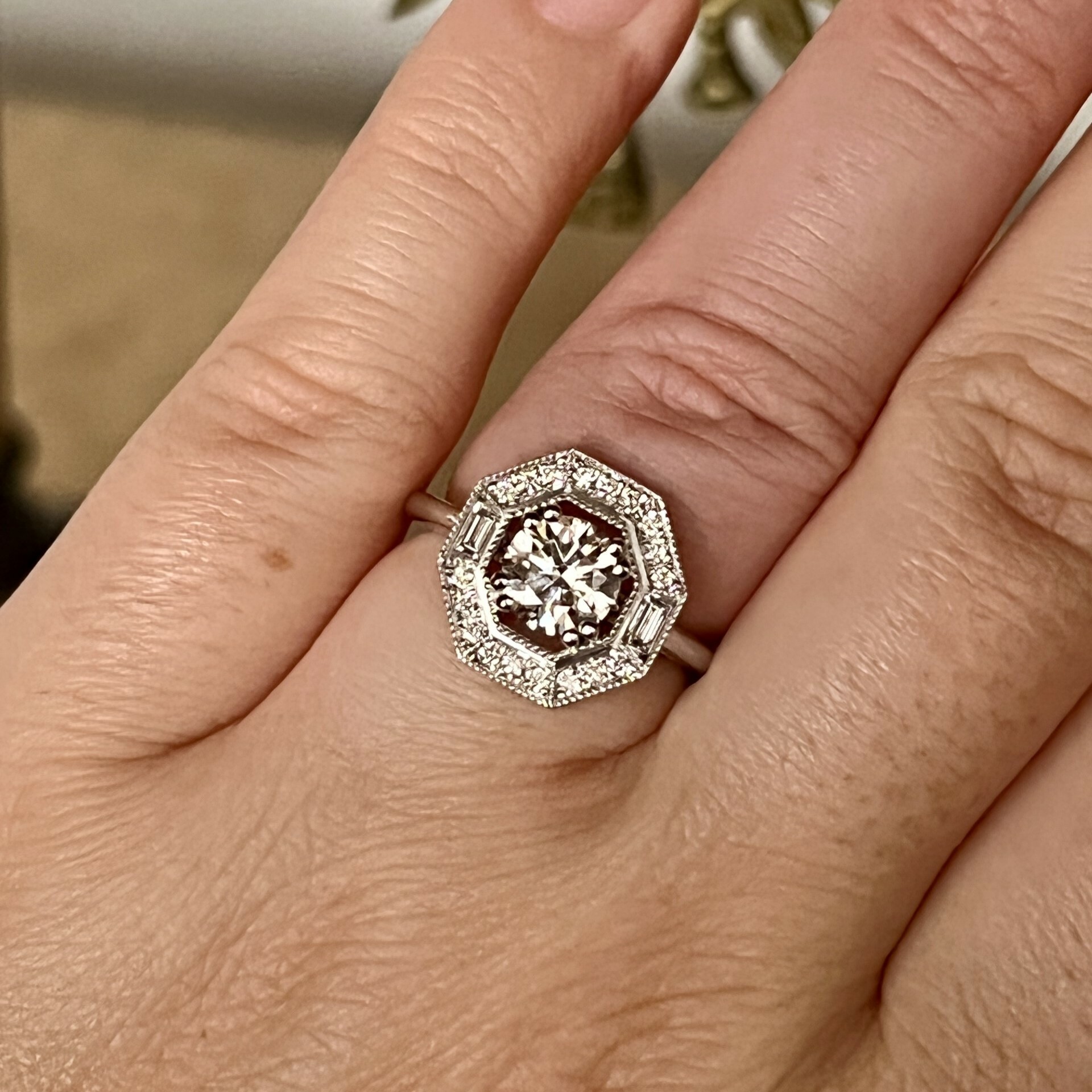 Bague en or blanc, monture d’inspiration Art Déco, sertie d’un diamant central de 1 carat, diamants baguette et diamants