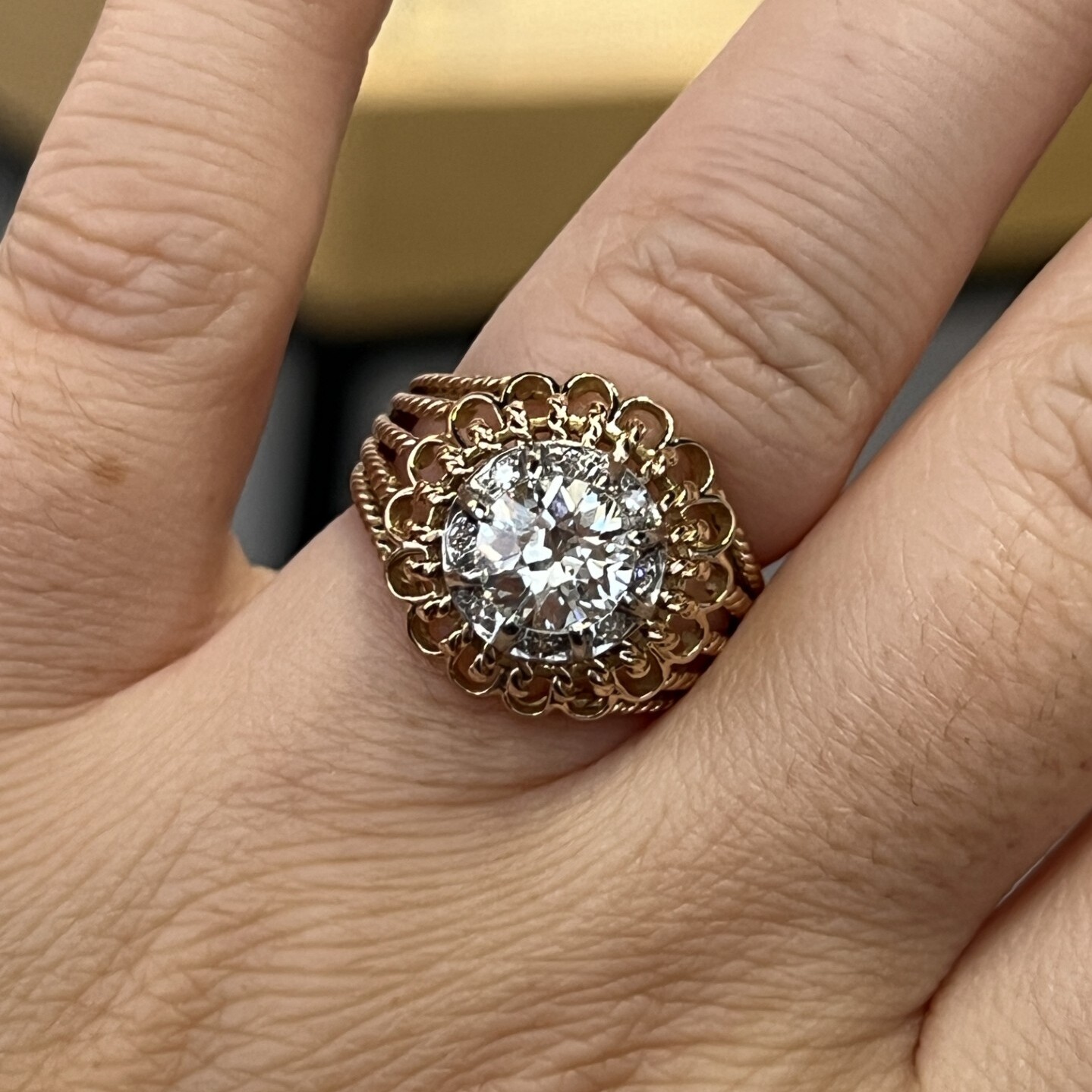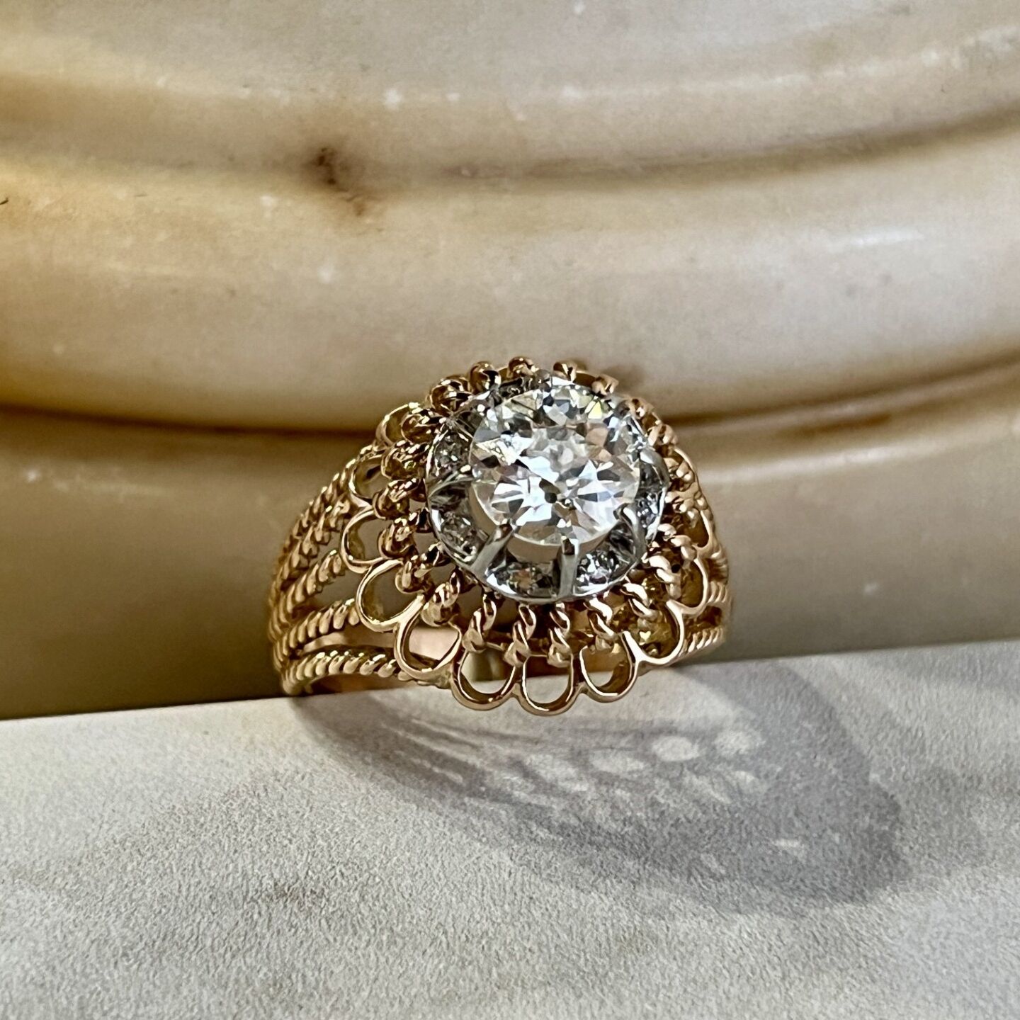 Vintage Bague Dôme en or rose, platine, diamant de taille ancienne de 1,25 carat et diamants 8x8 pour 0,08 carat