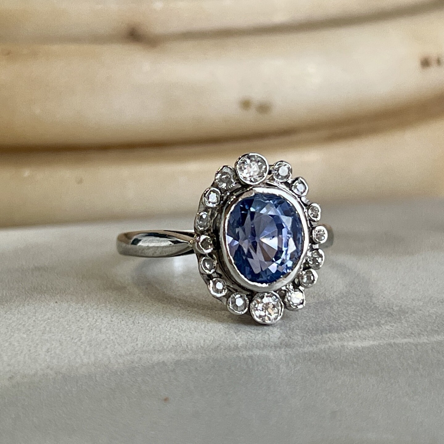 Vintage Bague en or blanc, saphir de Ceylan de 1,50 carat et diamants pour 0,40 carat