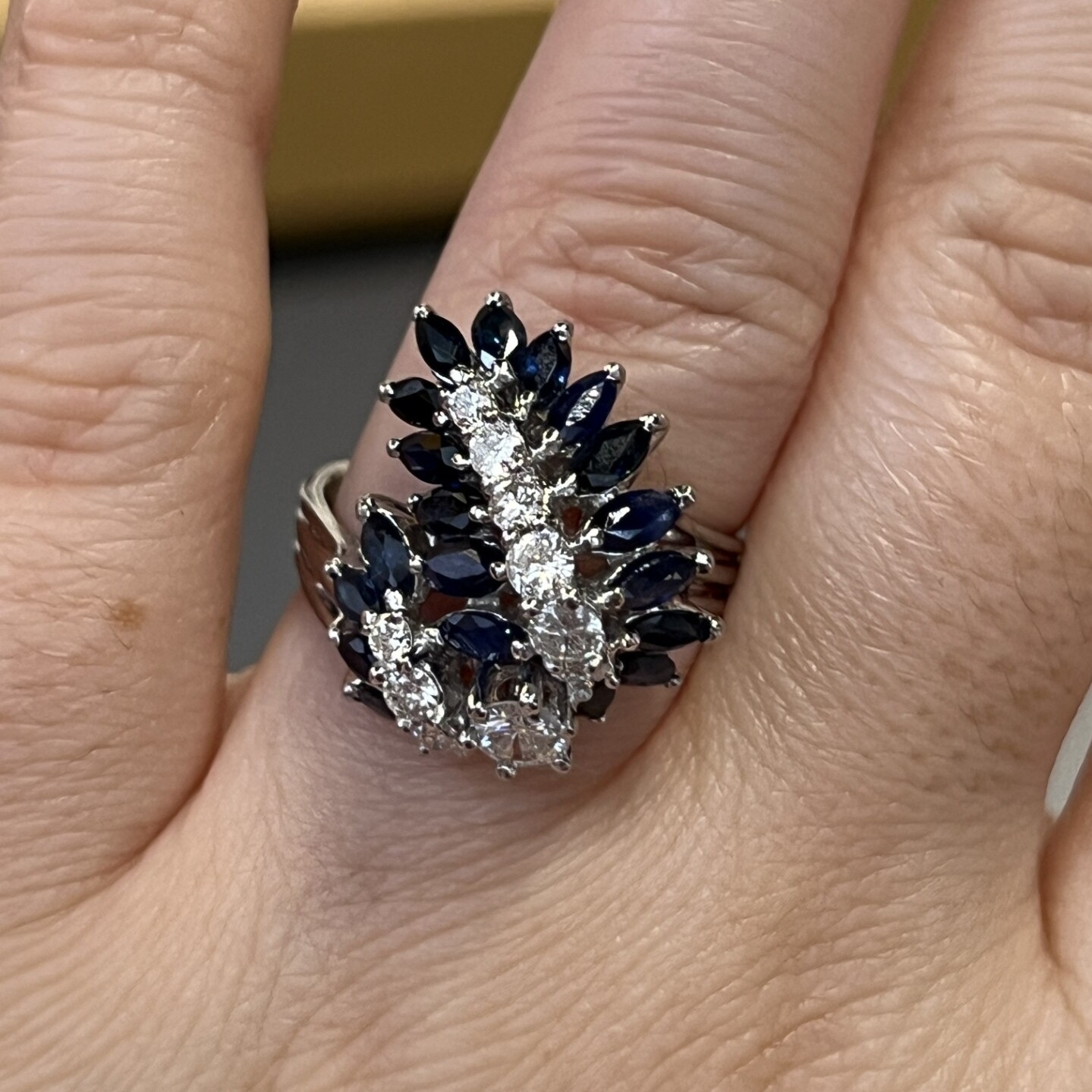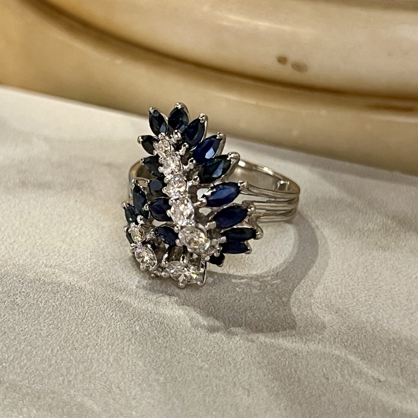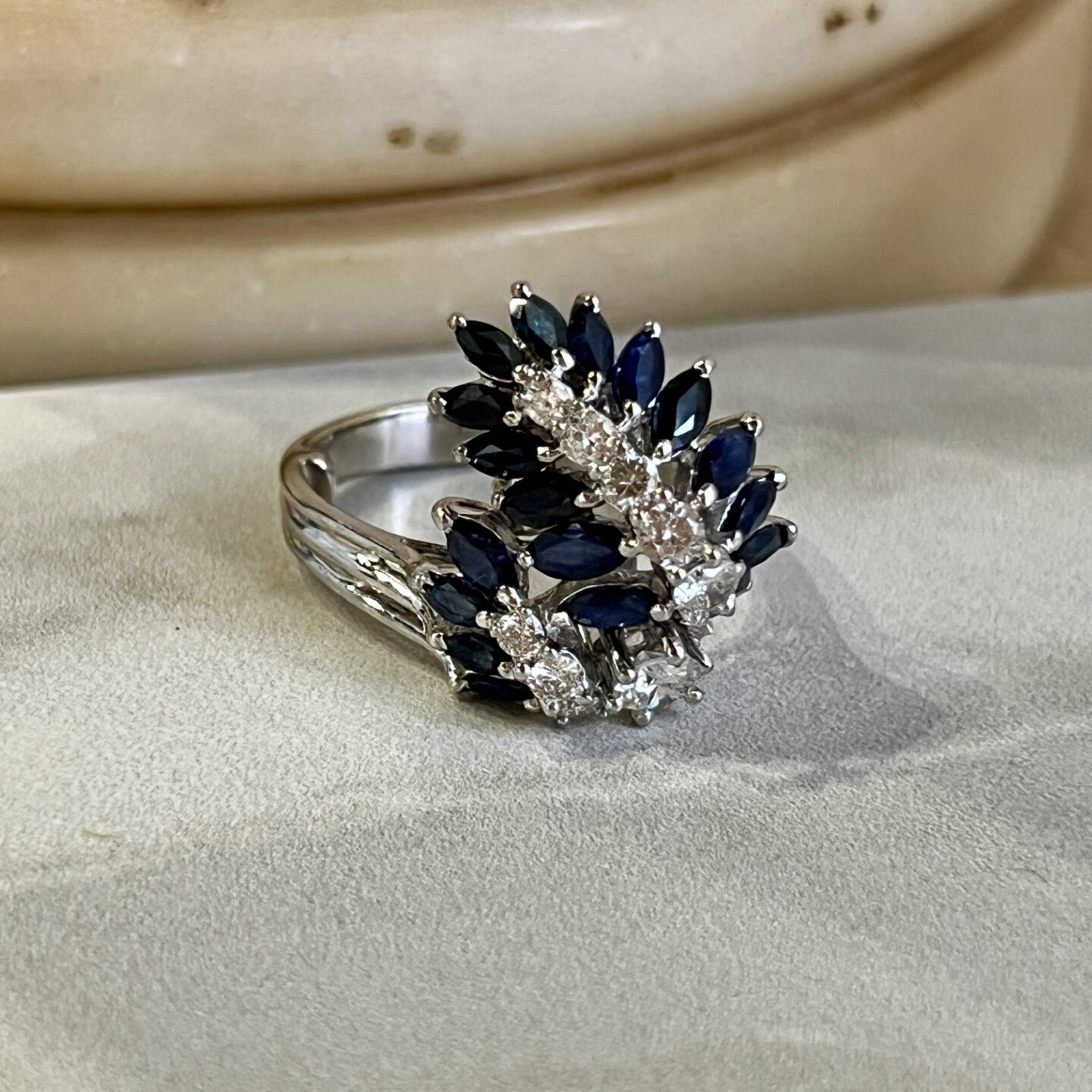 Vintage Bague en or blanc, saphirs de taille marquise pour 0,90 carat et diamants pour 0,70 carat