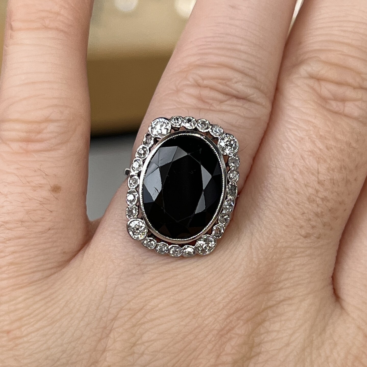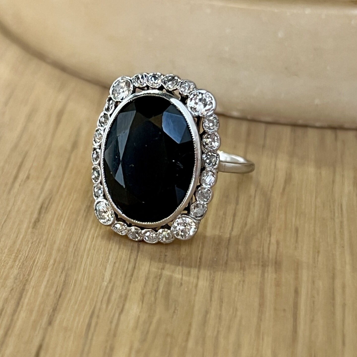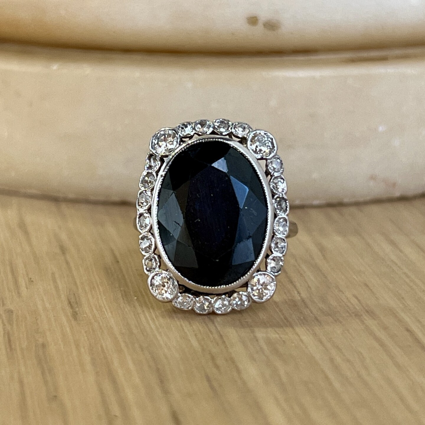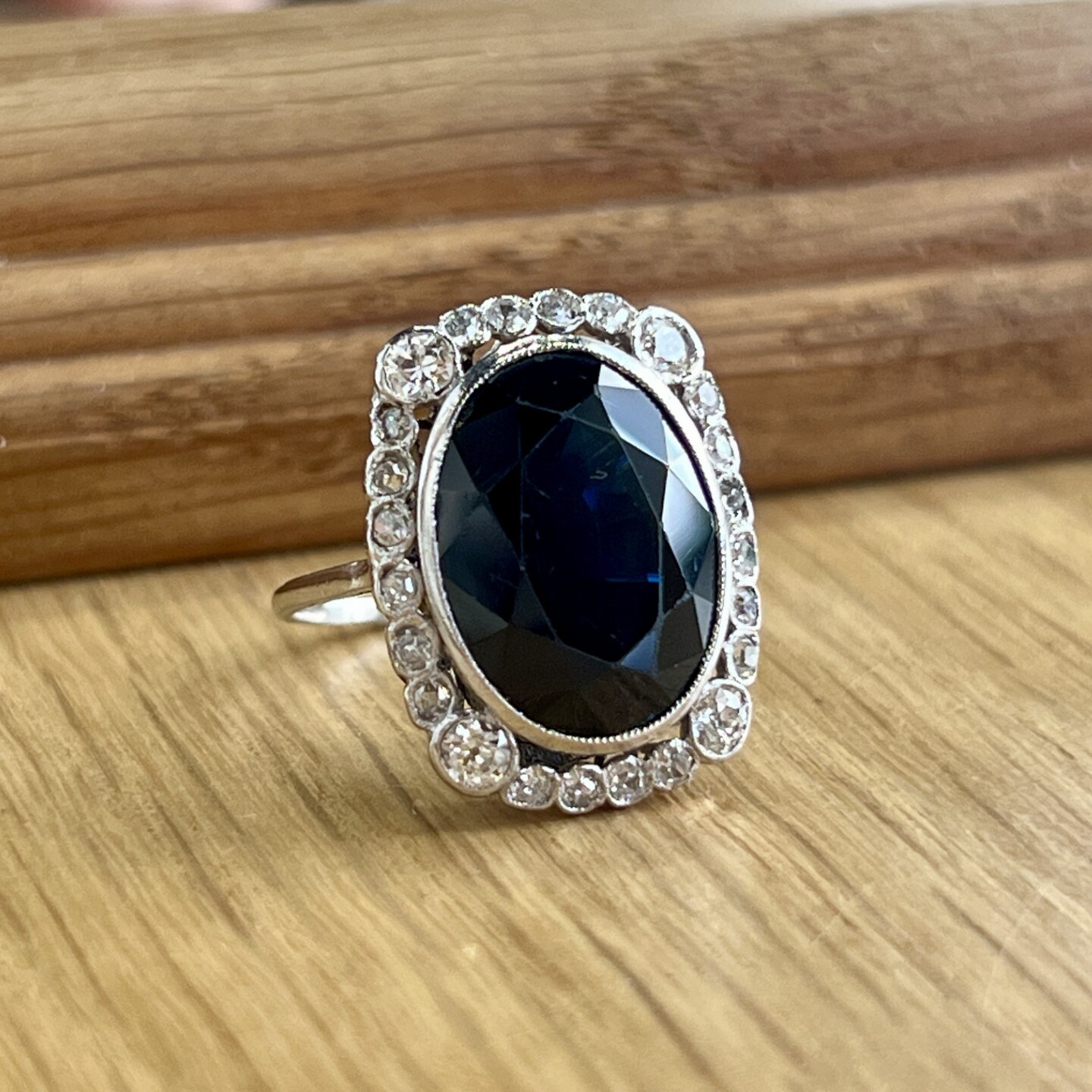 Vintage Bague Marguerite en or blanc, platine, saphir de taille ovale de 10,50 carats et diamants de taille ancienne de 0,60 carat