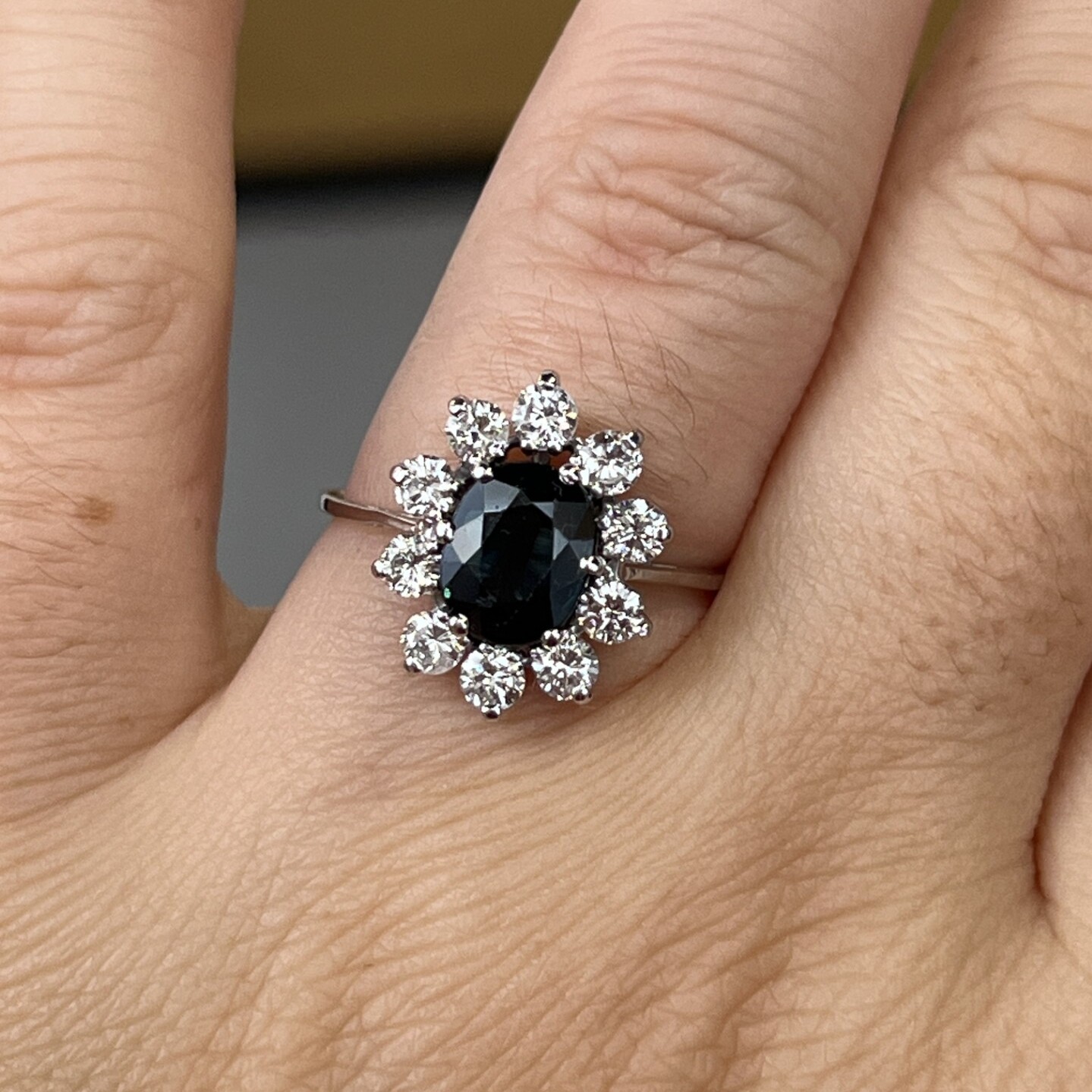 Vintage Bague Marguerite en or blanc, saphir de taille ovale de 1,20 carat et diamants pour 0,60 carat
