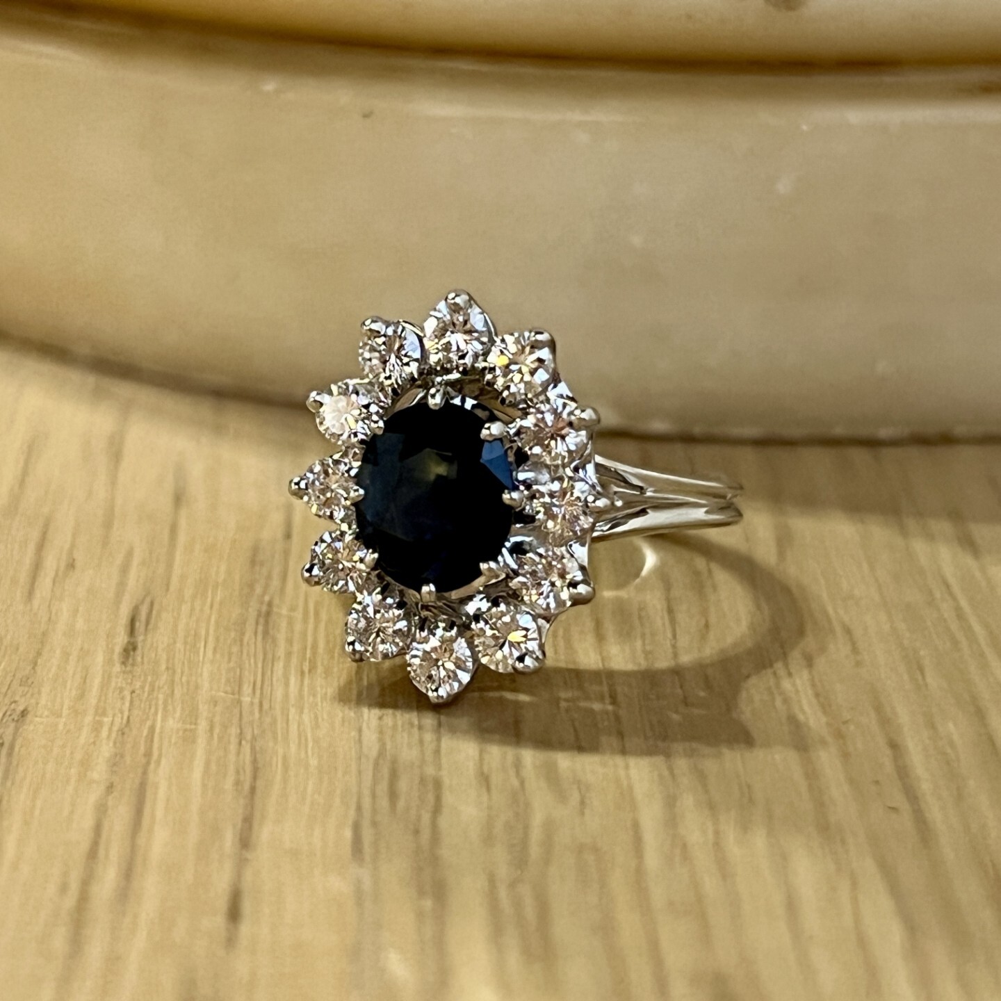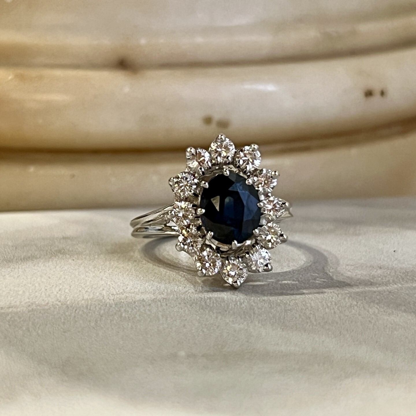 Vintage Bague Marguerite en or blanc, saphir de taille ovale de 1,90 carat et diamants pour 1,60 carat