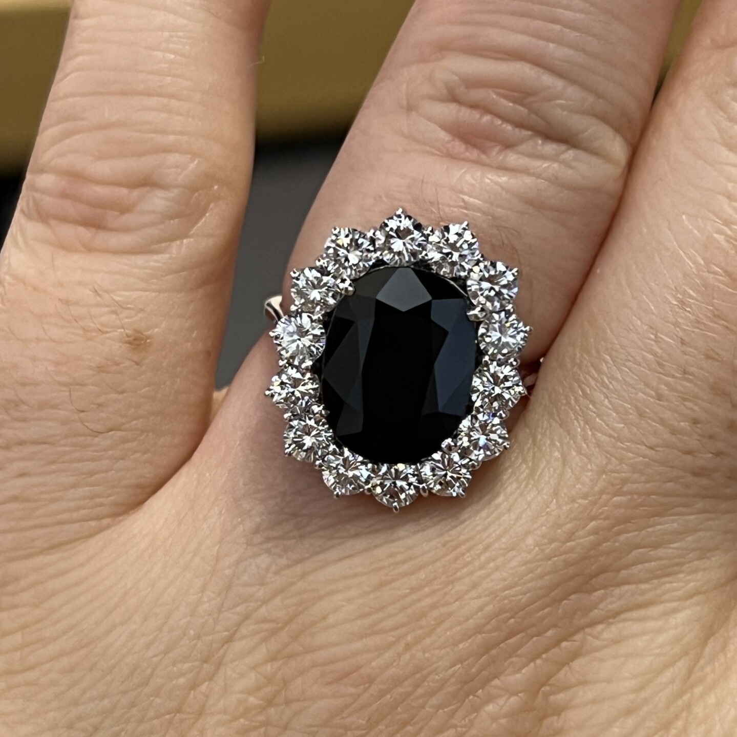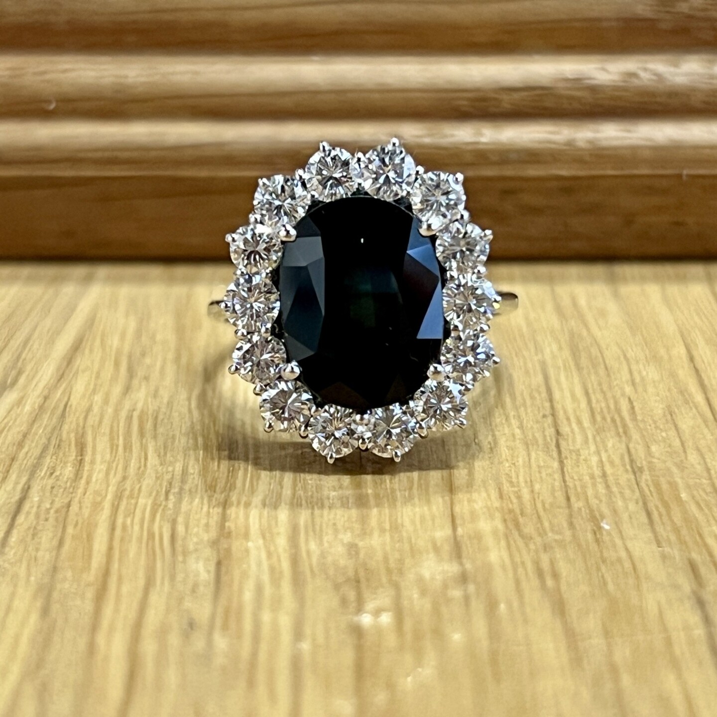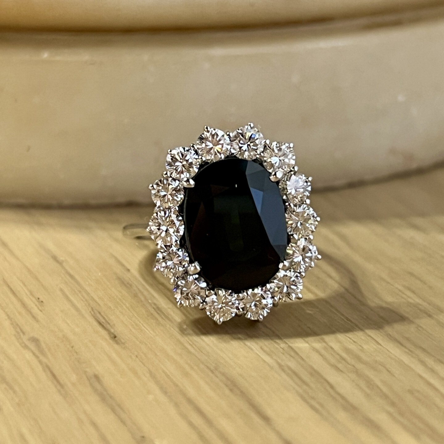 Vintage Bague Marguerite en or blanc, saphir de taille ovale de 1,80 carat et diamants pour 1 carat