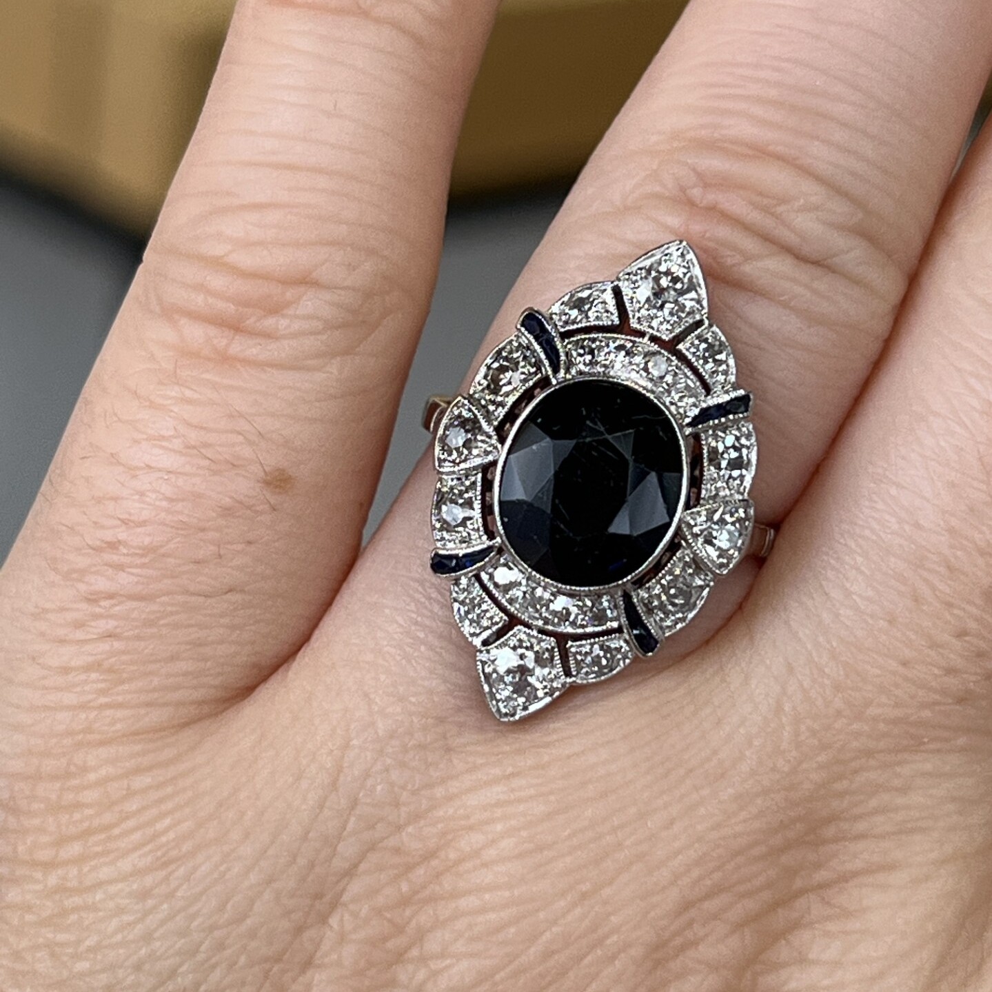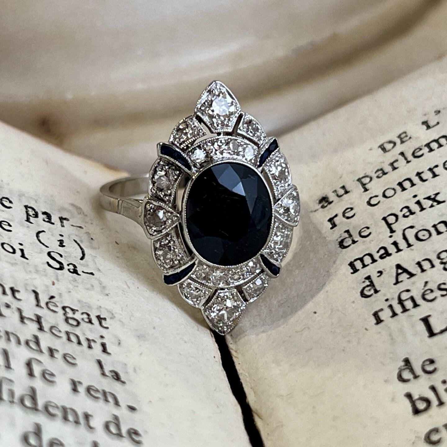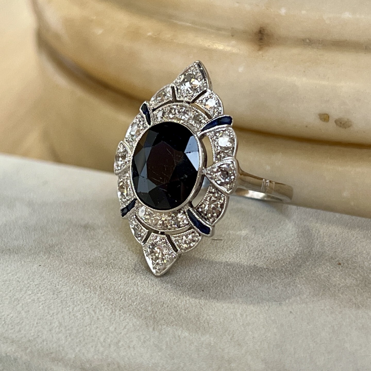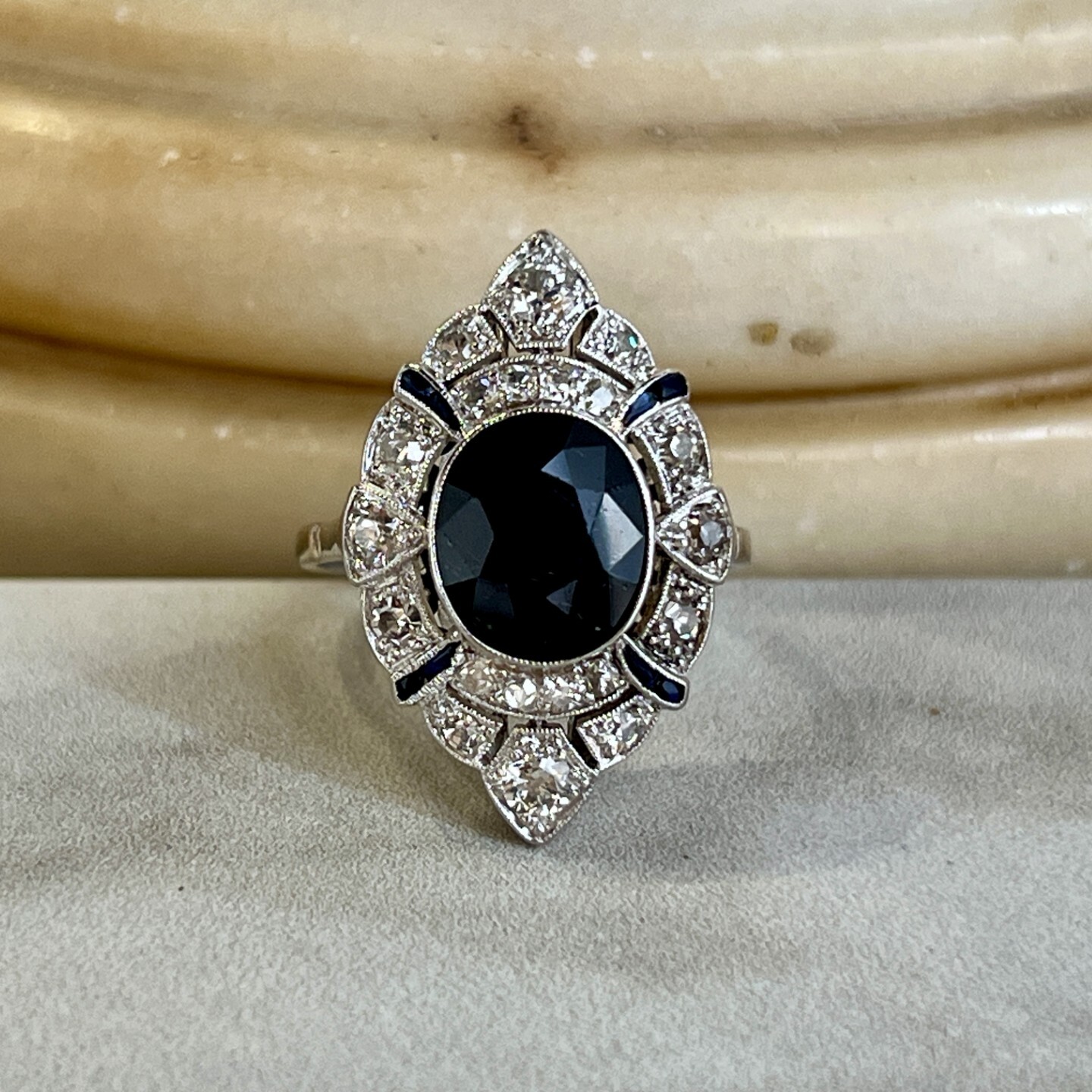 Vintage Bague Marquise en or blanc, platine, saphir ovale de 3,50 carats et diamants de taille ancienne pour 1 carat