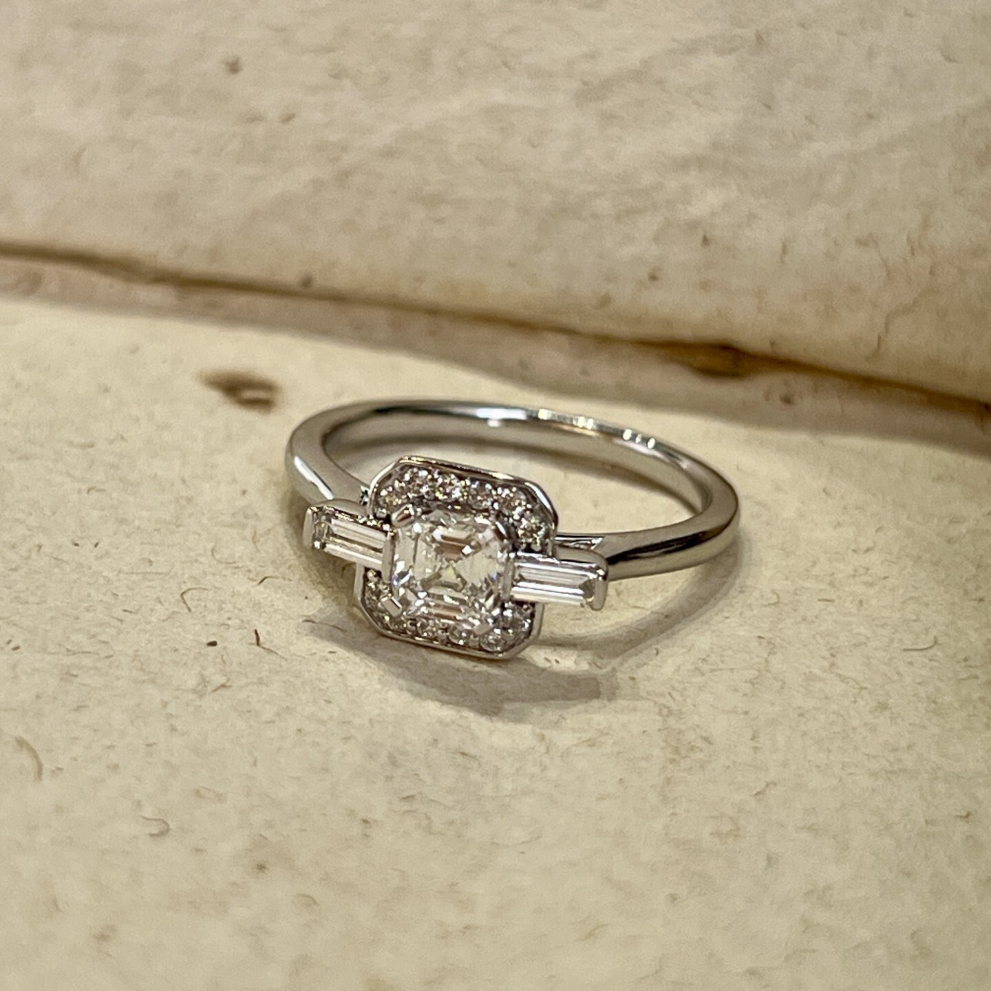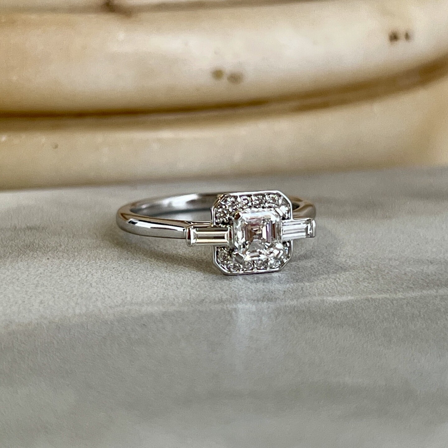 Bague Misia en or blanc, diamant de taille émeraude de 0,58 carat blanc exceptionnel E VS2, diamants baguette et diamants