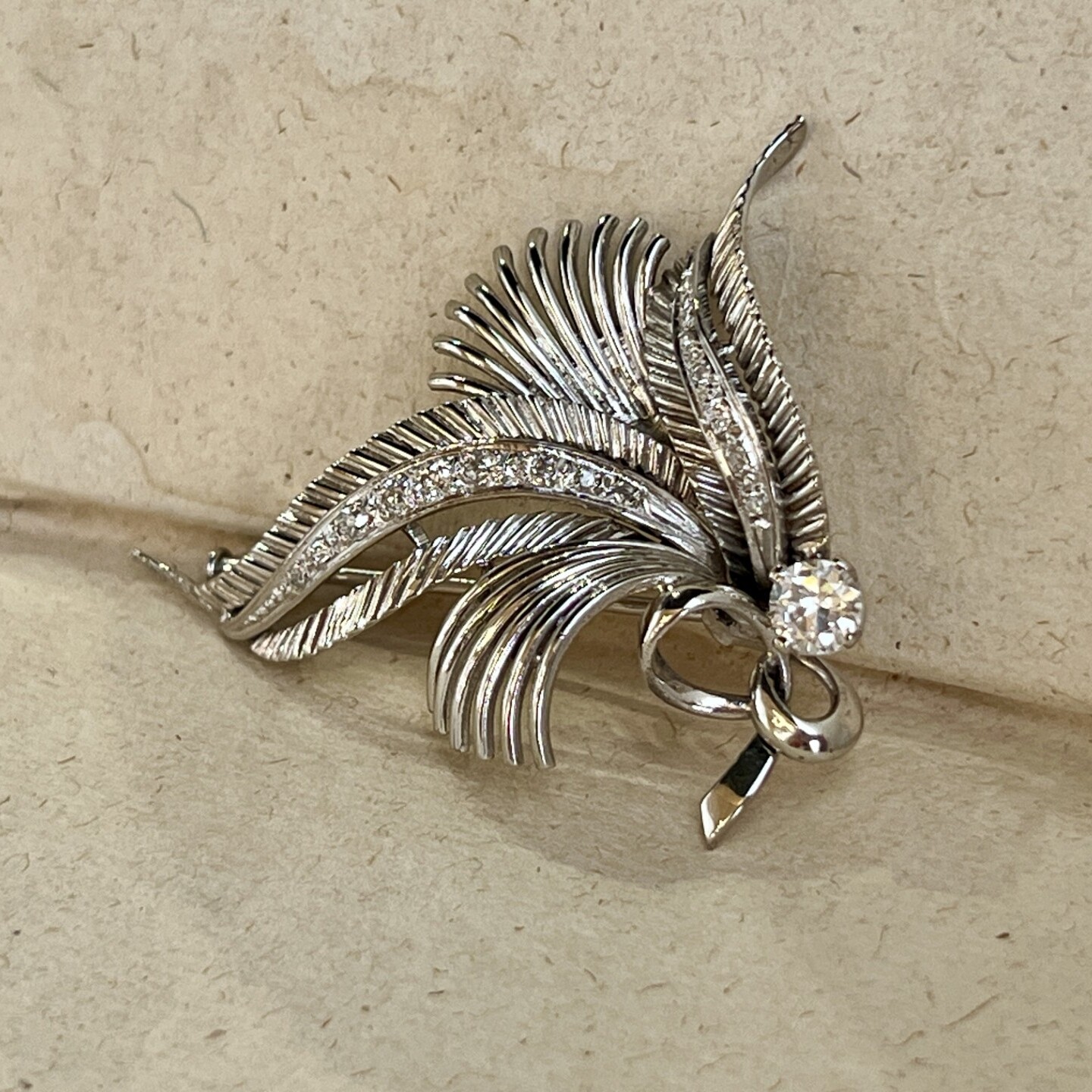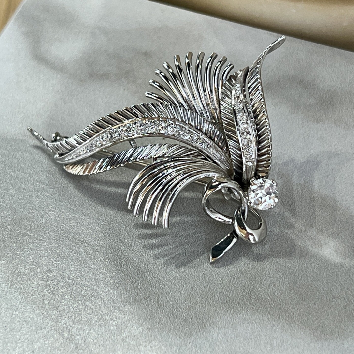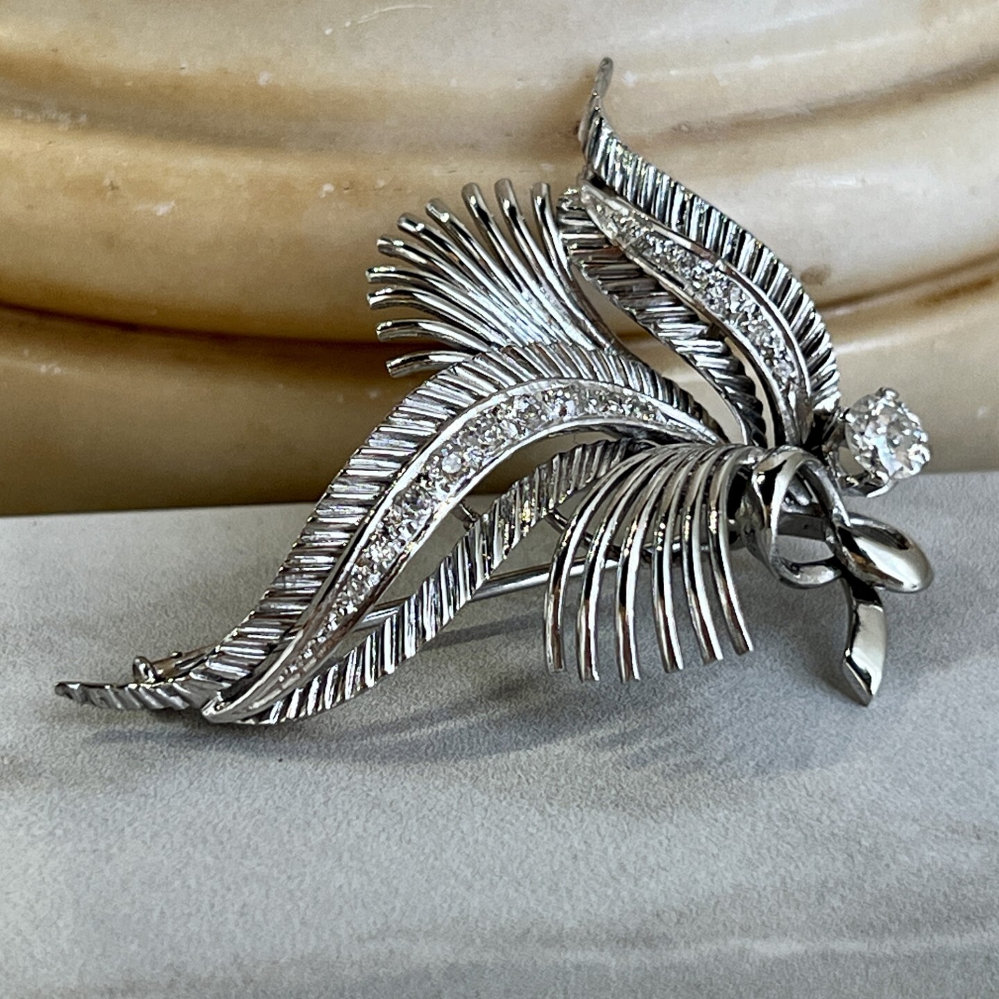 Vintage Broche Art Déco en or blanc, platine, diamants de demi-taille pour 2,20 carats et diamants de taille baguette pour 1,20 carat vers 1930